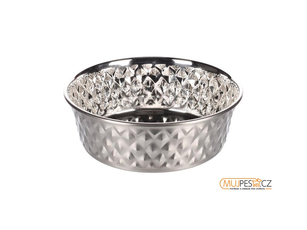 Elegantní stříbrná miska Flamingo Diami je vhodná pro psy všech plemen. Je vyrobena z odolné nerezové oceli a její spodní strana je opatřena gumovým kroužkem, který zabraňuje nechtěnému posouvání misky po podlaze během krmení. Misku můžete bez obav mýt v myčce na nádobí.