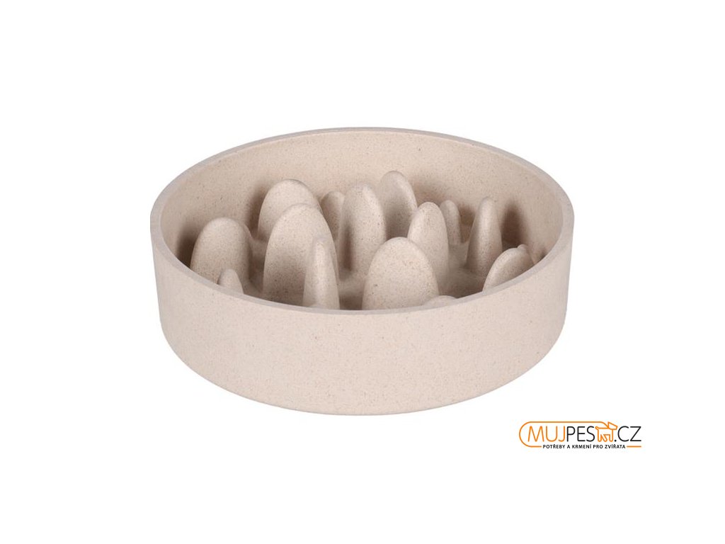 Zpomalovací misku lze naplnit granulemi, konzervou, kapsičkou nebo jejich kombinací. Výstupky v misce zajišťují pomalejší krmení. Pes musí vynaložit větší úsilí a obratnost, aby se dostal ke krmivu, a méně hltá. Miska ze směsi bambusu a plastu má protiskluzové dno. Myjte ji ručně.