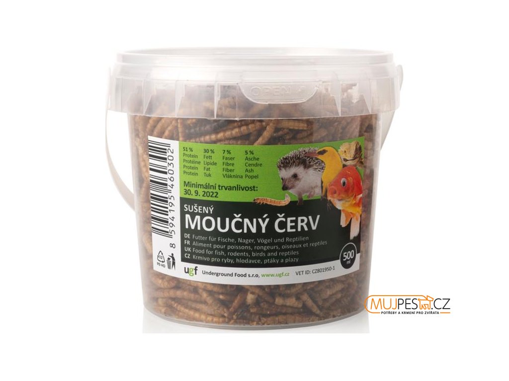 Moučný červ má nejvyváženější podíl proteinů (51 %) a tuků (30 %). Je zdrojem prebiotické vlákniny, vitamínů, minerálů a stopových prvků (komplex B, A, P, Ca, Mg, Fe, Zn). Obsahuje přirozeně se vyskytující taurin, který je nezbytný pro dobrý zdravotní stav zvířat a do krmiv je jinak přidáván synteticky. Podporuje zdravou kůži, srst, drápy, reprodukci i snůšku a posiluje imunitní systém zvířete.