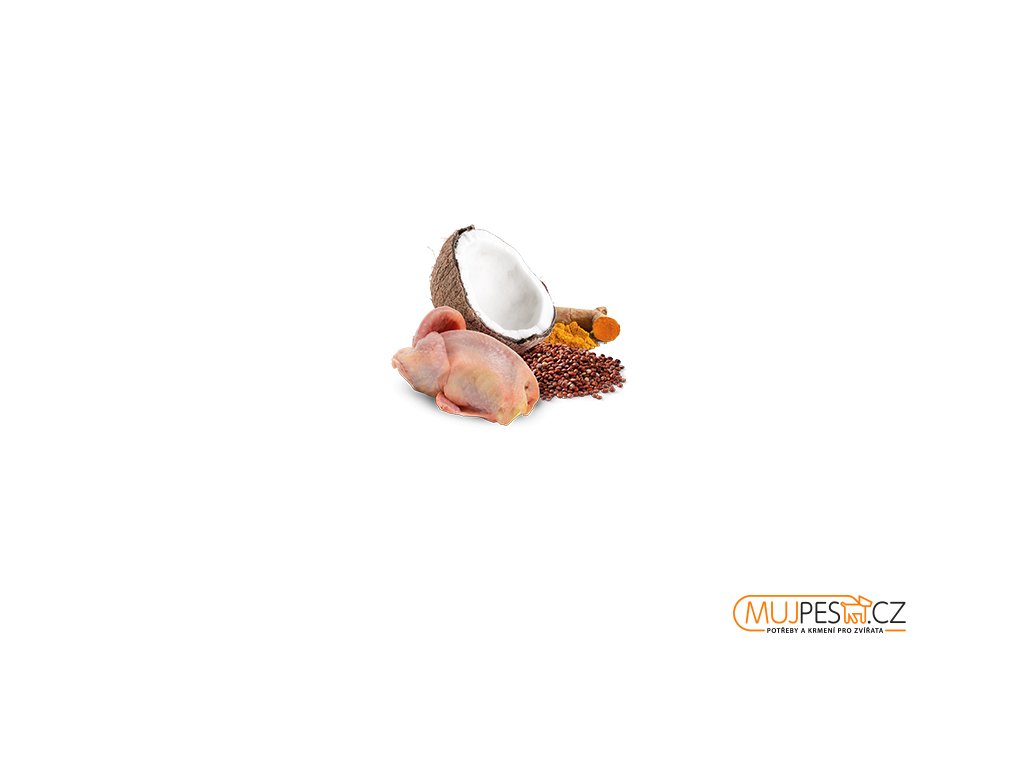 Suroviny: filet a stehýnka z křepelky (65%), semínka quinoi (5%), rybí olej, kokos (2%), fruktooligosacharidy, chondroitin sulfát, glukosamin, vitamíny, minerály.
