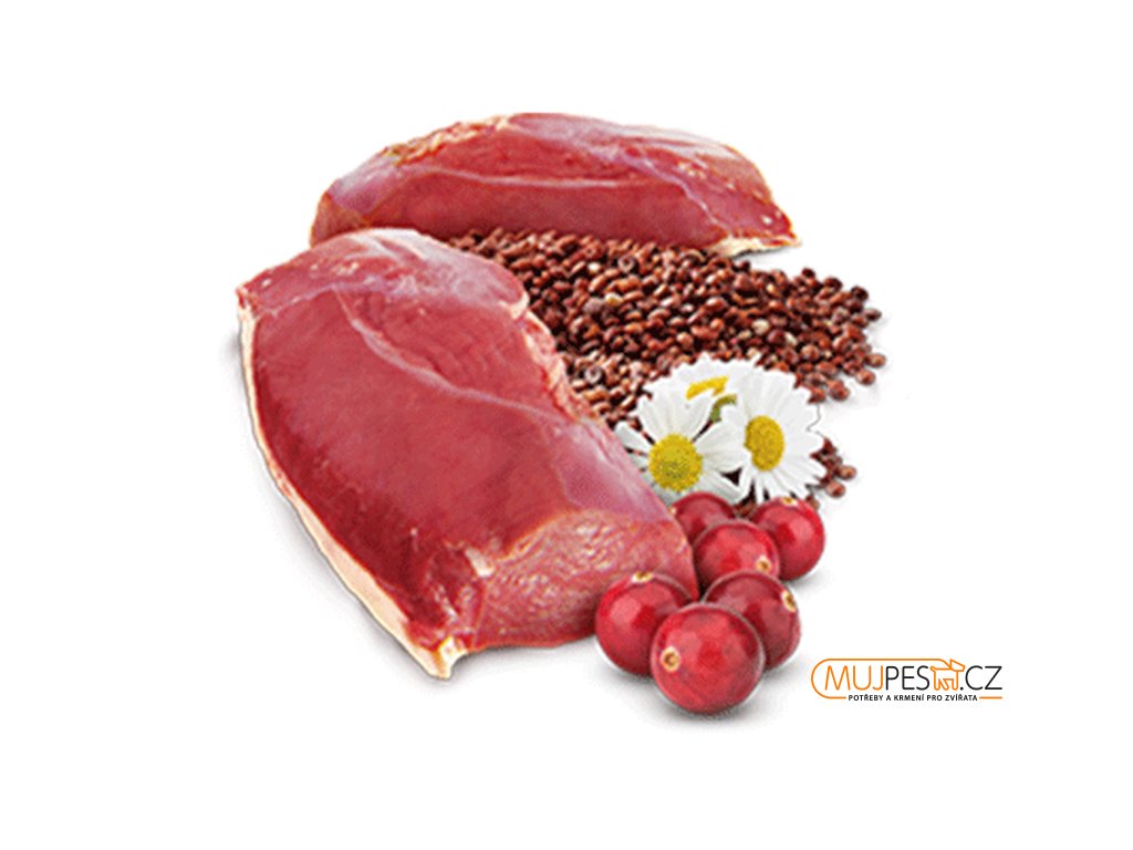 Složení: Kachní filet (60%), sleď, vařená vejce, semínka quinoi (5%), rybí olej, brusinky, heřmánek, fruktooligosacharidy, chondroitin sulfát, glukosamin, vitamíny, minerály.
