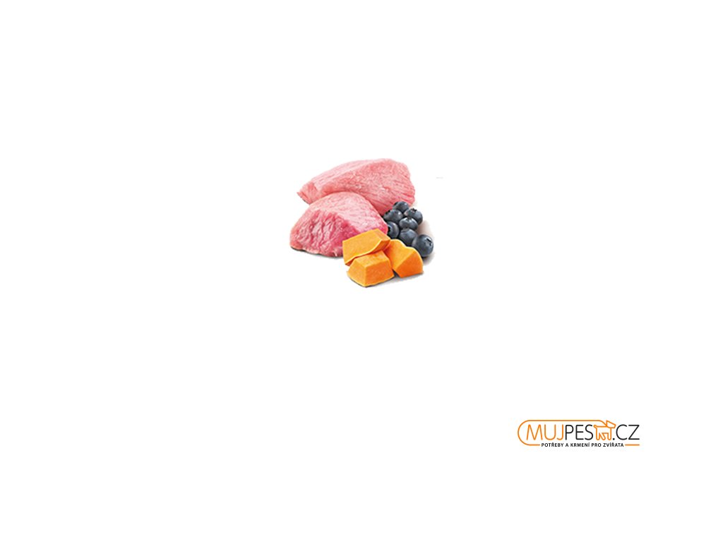 Složení: jehněčí kýta (40%), kuřecí filet, sleď, dýně (5%), batáty, vařená vejce, borůvky (4%), rybí olej, živočišný tuk, fruktooligosacharidy, chondroitin sulfát, glukosamin, vitamíny, minerály