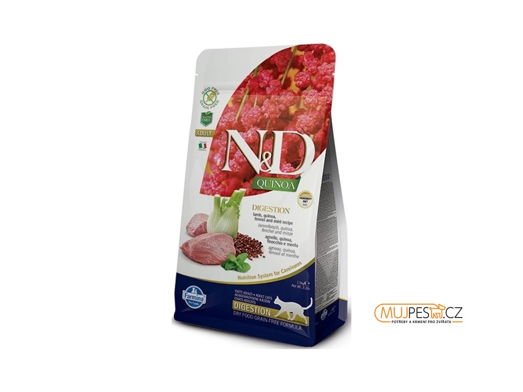 Farmina N&D Quinoa Digestion Lamb & Fennel je krmivo pro zvláštní účely výživy určené k podpoře kompenzace maldigesce a exokrinní pankreatické nedostatečnosti.