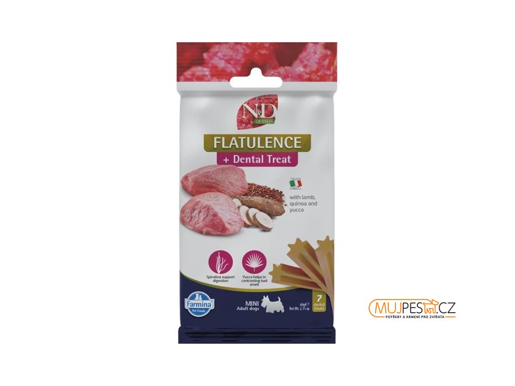 Kolem 80 % dospělých psů čelí problémům v dutině ústní. Parodontální onemocnění je navíc spojeno s vyšším rizikem srdečních a ledvinových problémů. Předcházejte těmto potížím s pomocí dentálních tyčinek N&D Quinoa Flatulence Dental Treat určených pro psy a štěňata (od 4 měsíců) malých plemen trpících plynatostí. Quinoa podporuje trávení, absorpci živin a celkově zdraví trávicího traktu. Juka pomáhá snižovat nepříjemný zápach a spirulina zlepšovat fungování metabolismu.