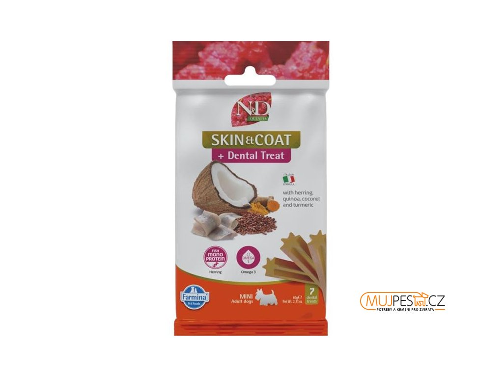 Kolem 80 % dospělých psů čelí problémům v dutině ústní. Parodontální onemocnění je navíc spojeno s vyšším rizikem srdečních a ledvinových problémů. Předcházejte těmto potížím s pomocí dentálních tyčinek N&D Quinoa Skin & Coat Dental Treat určených pro psy a štěňata (od 4 měsíců) malých plemen. Quinoa podporuje trávení, absorpci živin a celkově zdraví trávicího traktu. Omega-3 a omega-6 mastné kyseliny podporují zdraví kůže a lesk srsti.