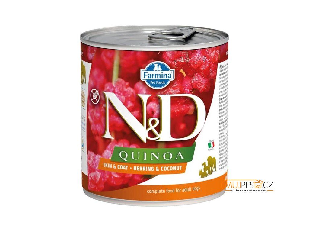 Farmina N&D Quinoa Herring & Coconut je krmivo pro zvláštní účely výživy určené k podpoře omezení intolerance určitých komponentů a živin.