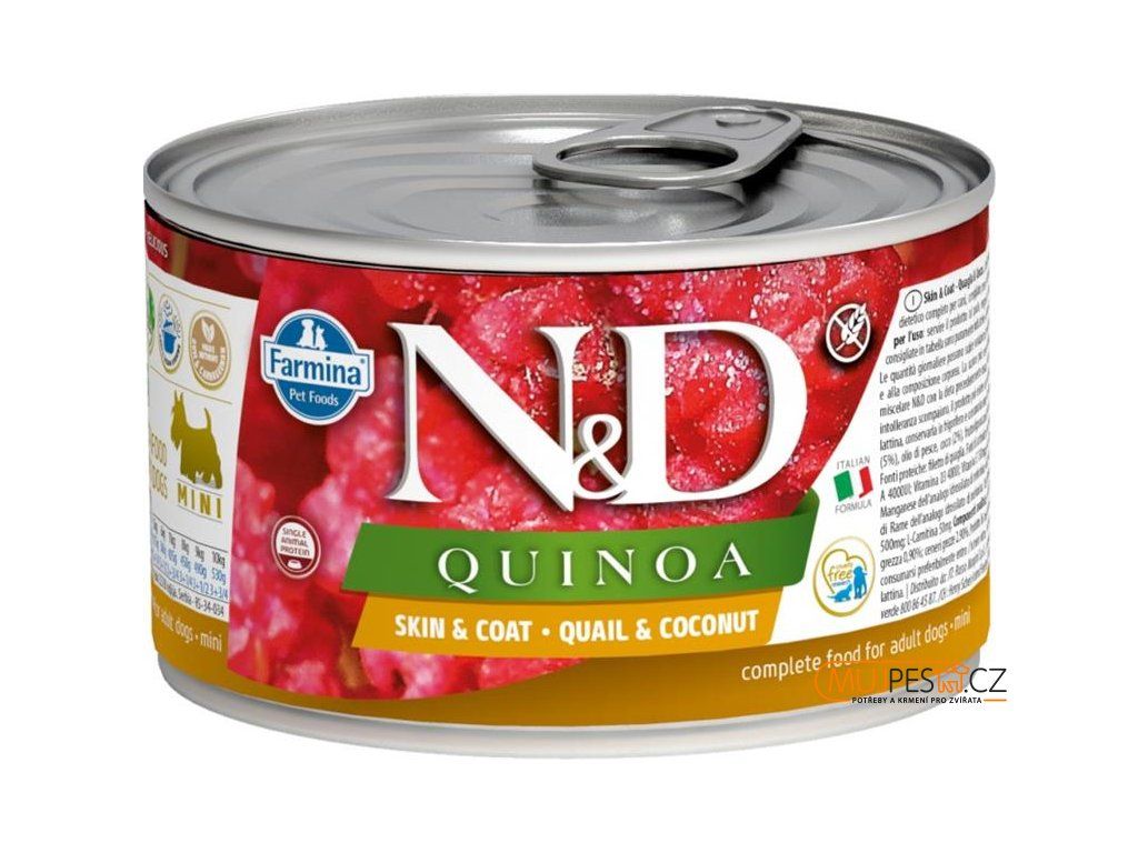 Farmina N&D Quinoa Quail & Coconut je krmivo pro zvláštní účely výživy určené k podpoře omezení intolerance určitých komponentů a živin.