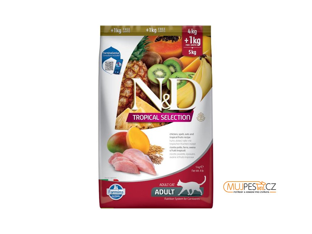 Kompletní nízkoobilné krmivo s kuřecím masem a tropickým ovocem pro dospělé kočky. Řada N&D Tropical selection v sobě kombinuje kvalitní zdroje živočišných bílkovin, vysoce kvalitní obiloviny a chutné tropické ovoce pro nasycení vašeho zvířecího kamaráda.