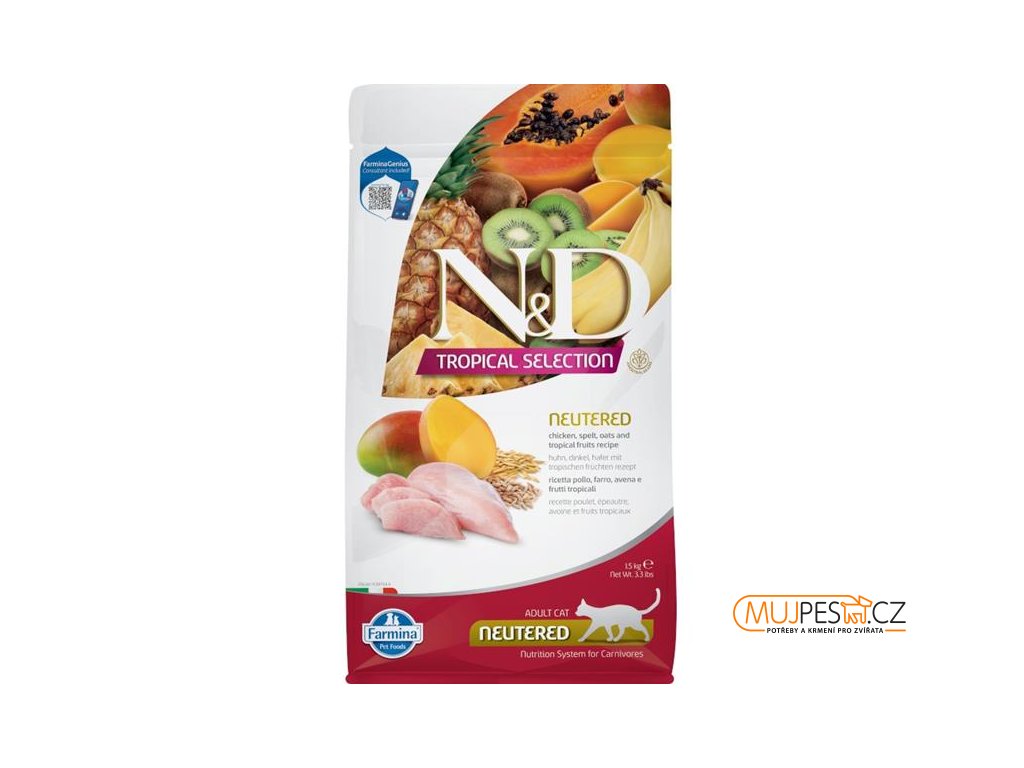 Kompletní nízkoobilné krmivo s kuřecím masem a tropickým ovocem pro dospělé kastrované kočky. Řada N&D Tropical selection v sobě kombinuje kvalitní zdroje živočišných bílkovin, vysoce kvalitní obiloviny a chutné tropické ovoce pro nasycení vašeho zvířecího kamaráda.
