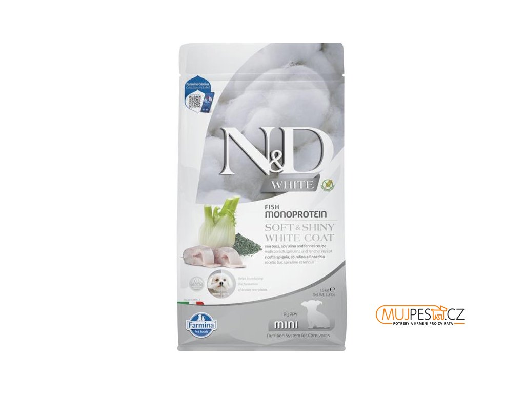 N&D WHITE Dog GF Sea Bass, Spirulina & Fennel Puppy Mini 1,5 kg