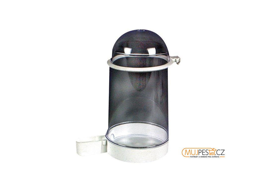 Plastová napáječka na vodu pro papoušky s úzkým pítkem. Napáječku lze zavěsit na dráty klece. Tmavá barva napájky omezuje tvorbu řas.