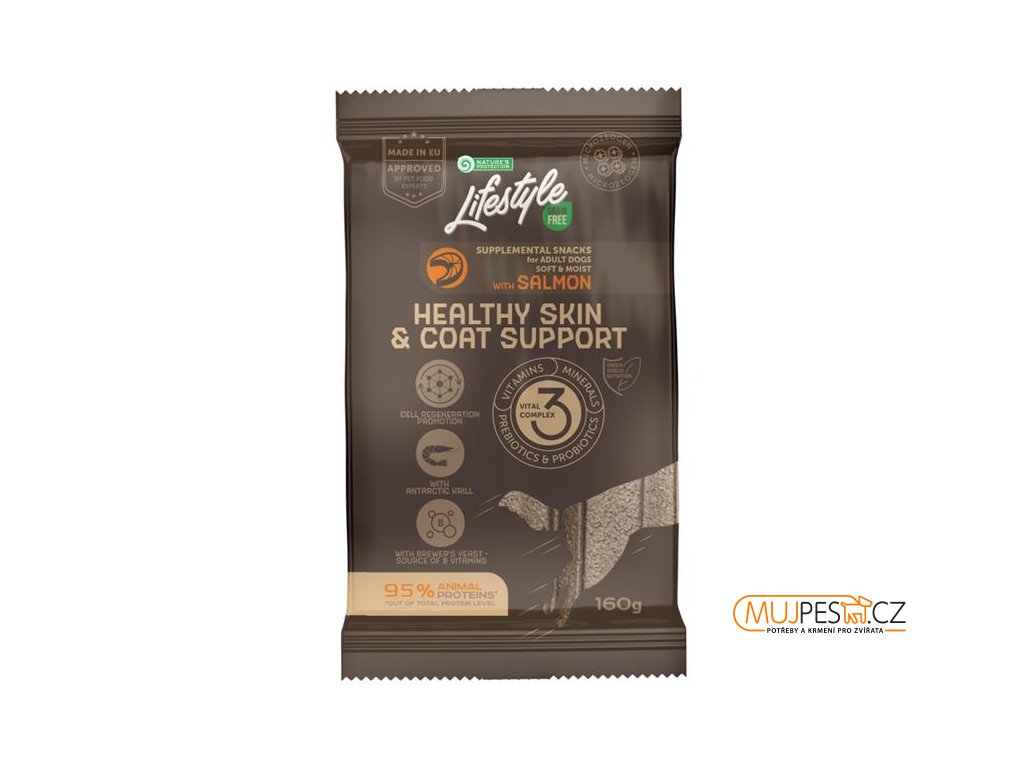 Pochoutky pro aktivní dospělé psy, pomáhají podporovat zdravou kůži a srst.