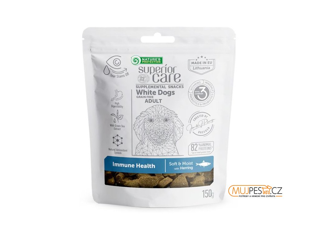 Nature’s Protection Superior Care White Dogs Adult Immune Health je prémiový doplněk stravy se sleděm vyvinutý speciálně pro dospělé psy všech plemen s bílou nebo světlou srstí pro podporu jejich imunitního systému. Jsou vhodné i pro psy, u nichž je třeba regulovat tělesnou hmotnost. Jsou grain-free – pamlsky neobsahují obiloviny, které by mohly způsobit alergické reakce. Mají vyvážené množství probiotik a prebiotik, díky čemuž přispívají k harmonizaci střevního prostředí, podporují zdravé střevní bakterie a napomáhají hladkému trávení.