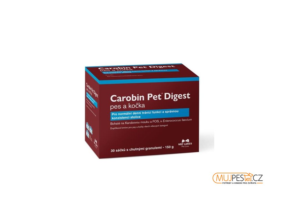 NBF Lanes Carobin Pet Digest je přírodní doplňkové krmivo ve formě prášku určené pro psy a kočky všech věkových kategorií. Obsahuje karobovou moučku, fruktoligosacharidy (FOS) a probiotikum Enterococcus faecium, které podporují správnou funkci trávicího traktu. Působí proti nadýmání, zápachu z tlamy, kručení v břiše a koprofágii. Zlepšuje konzistenci stolice a přispívá k hygieně perianální oblasti. Neobsahuje živočišné bílkoviny, a je tudíž vhodné i při dietním režimu.