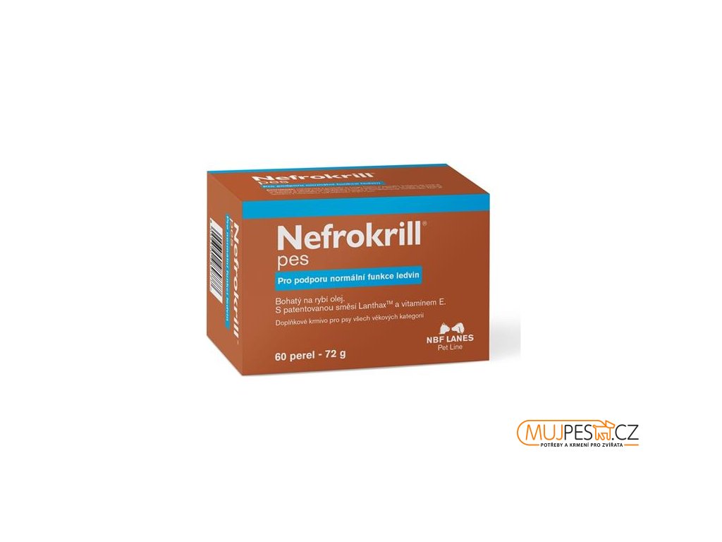 NBF Lanes Nefrokrill je přírodní doplňkové krmivo ve formě kapslí určené pro dospělé a starší psy se zhoršenou funkcí ledvin. Kombinace rybího oleje (70 % EPA, 10 % DHA) a složek LantaxuTM (uhličitan vápenatý, krilový olej, chitosan, hydrogenuhličitan sodný) přispívá k ochraně ledvin a podpoře jejich činnosti. Přípravek je vhodný zejména při chronickém selhání ledvin doprovázeném proteinurií, hyperfosfatémií a hypokalémií.