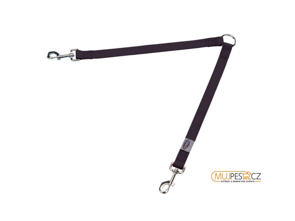 Pevná textilní rozdvojka. která Vám umožní při procházce s dvěma pejsky používat pouze jedno vodítko. Černá barva. Šíře 15mm, délka 2x40cm.