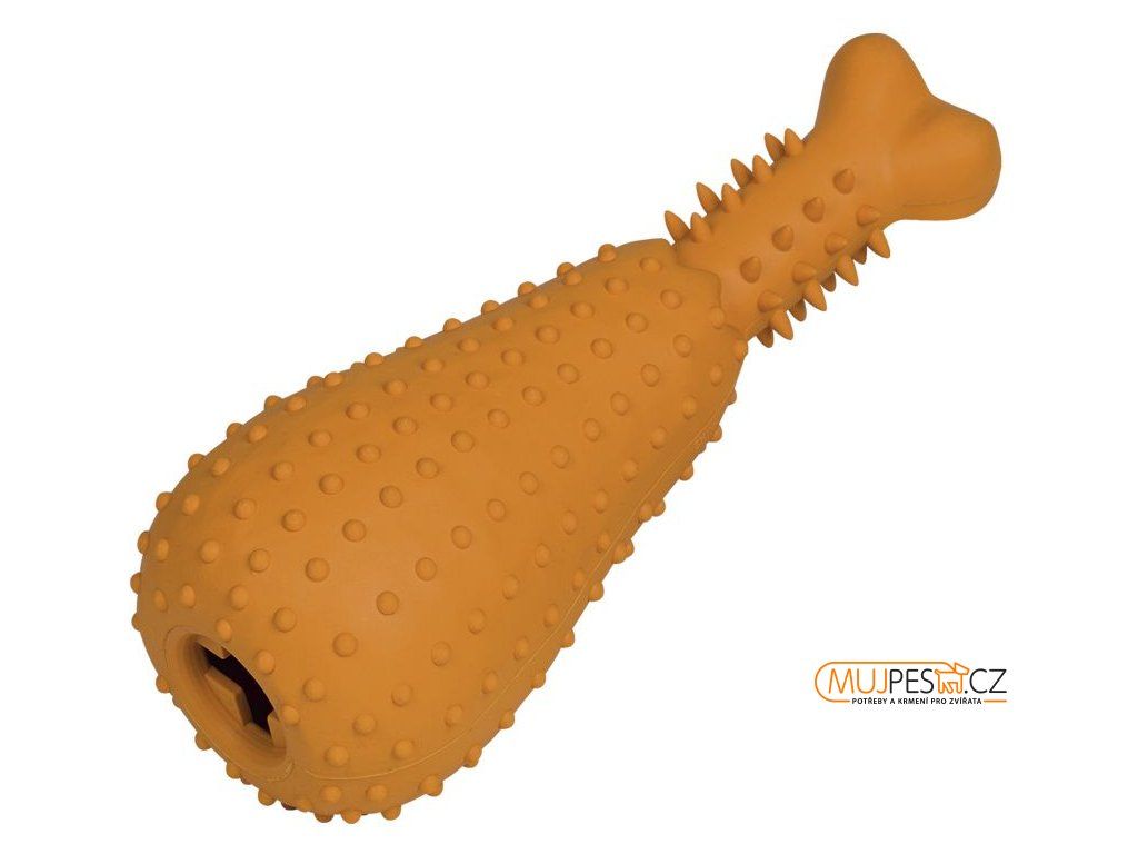 Pevná gumová hračka Nobby ve tvaru kuřecího stehýnka. Hračka má otvor, který můžete plnit suchými pamlsky. Vhodné i k samostatné hře. Barva oranžová.