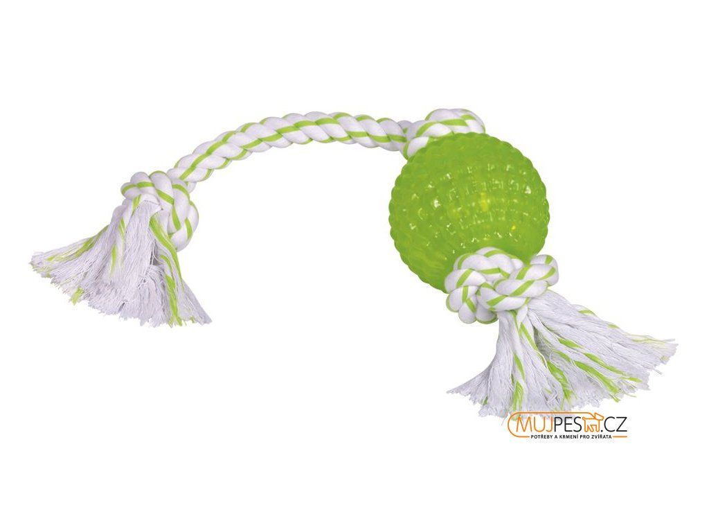 Hračka pro psy z TRP gumy. Míček s bavlněnným lanem. S vůní máty a s pískátkem.
