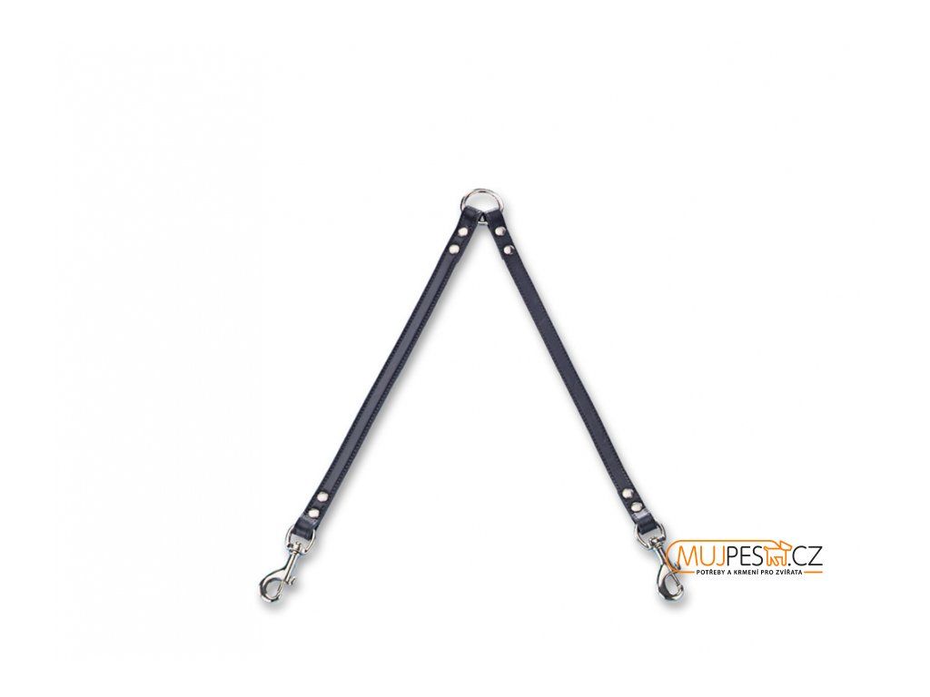 Pevná kožená rozdvojka z jemně vypracovaná hovězí kůže. Umožní Vám při procházce s dvěma pejsky používat pouze jedno vodítko. Šíře 12mm, délka 2x35cm.