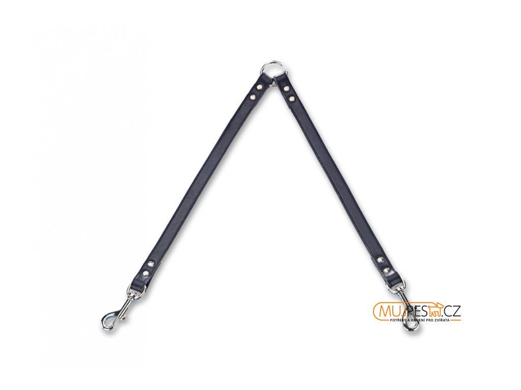 Pevná kožená rozdvojka z jemně vypracovaná hovězí kůže. Umožní Vám při procházce s dvěma pejsky používat pouze jedno vodítko. Šíře 18mm, délka 2x45cm.