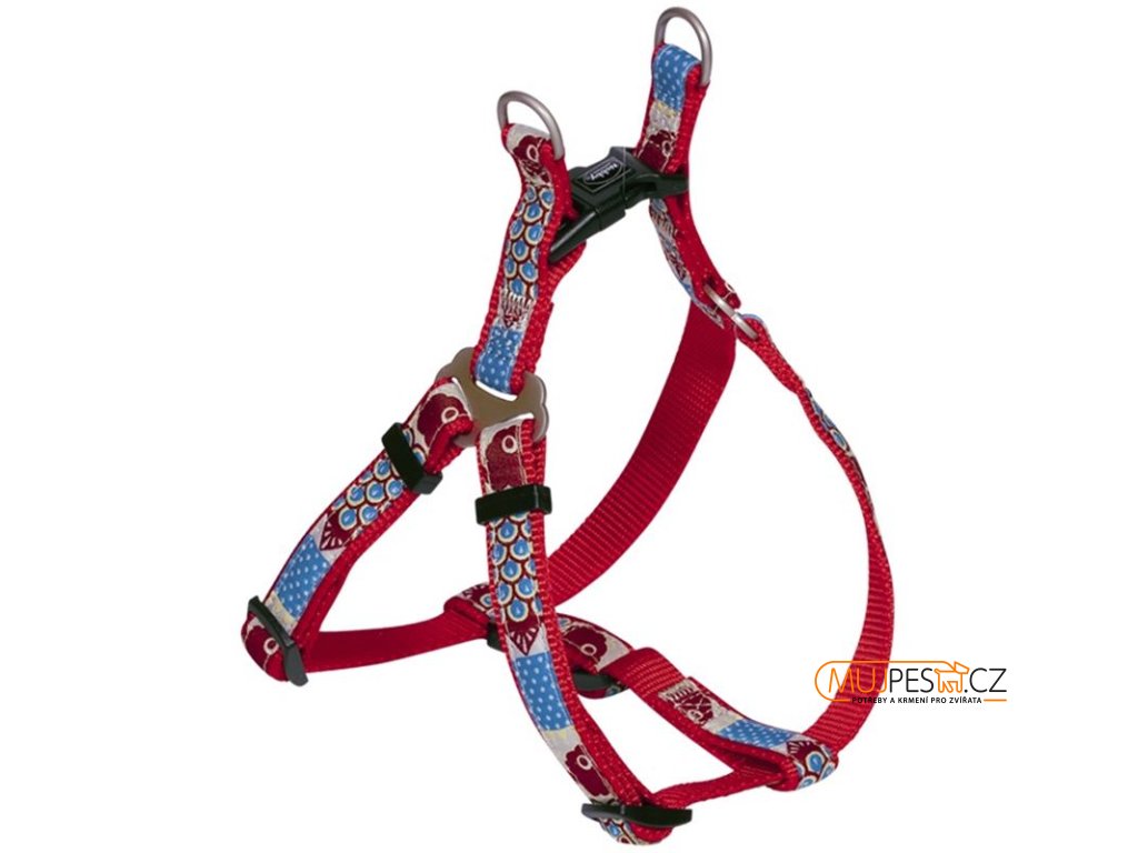 Kvalitní postroj Nobby na psa v rychloupínacím provedení. Pes se oblékne velice snadno, postroj položí na zem, pes si našlápne předníma nohama do otvorů postroje a ten se pak zapne přes hřbet na sponu. Vyrobený z pevného a odolného nylonového popruhu, který je pošitý vzorovanou nášivkou. Postroj je vybavený kovovými kroužkky pro připnutí vodítka.