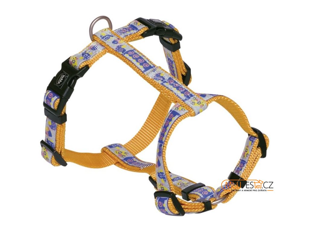 Kvalitní postroj Nobby vyrobený z pevného a odolného nylonového popruhu, který je pošitý vzorovanou nášivkou. Postroj je vybavený kovovým kroužkem pro připnutí vodítka.