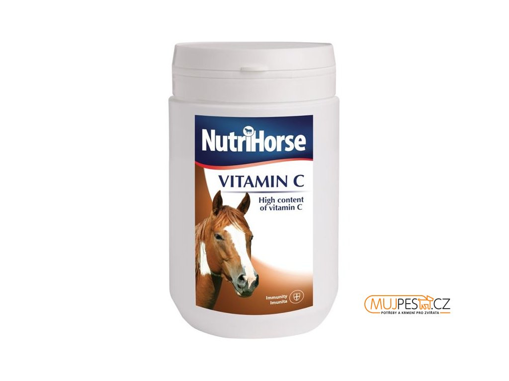 NutriHorse VITAMIN C je ve vodě rozpustný doplněk pro koně s vysokým obsahem vitaminu C, který posiluje imunitu a zvyšuje obranyschopnost organismu vůči infekčním onemocněním. Jeho podávání pomáhá snadněji zvládnout stresové situace, jakými jsou déletrvající přesuny, tepelný stres, závody, odstav hříbat či rekonvalescence. Vitamin C je nesmírně důležitý pro správnou činnost kloubní chrupavky.