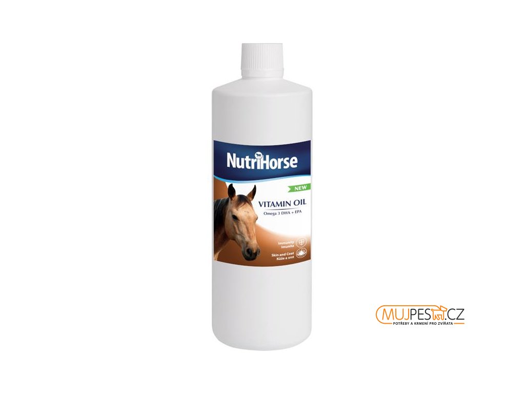VITAMÍN OIL je tekuté doplňkové krmivo pro koně obsahující směs rostlinných a živočišných olejů, obohacené o vitamíny A, D3 a E. Jde o vitamíny rozpustné v tucích, které jsou v rostlinné stravě koní vzácné, ale v jejich výživě hrají důležitou roli. Vitamín E je významným antioxidantem, který neutralizuje volné radikály způsobující poškození tělních tkání. Vitamín D je důležitý u rostoucích zvířat a jeho nedostatek může způsobit poruchy růstu a špatný vývoj kosterní soustavy. Jeho podání je vhodné při léčbě zlomenin kostí nebo u koní s omezeným pohybem na slunci. Vitamín A je důležitý pro celkové zdraví organismu.
