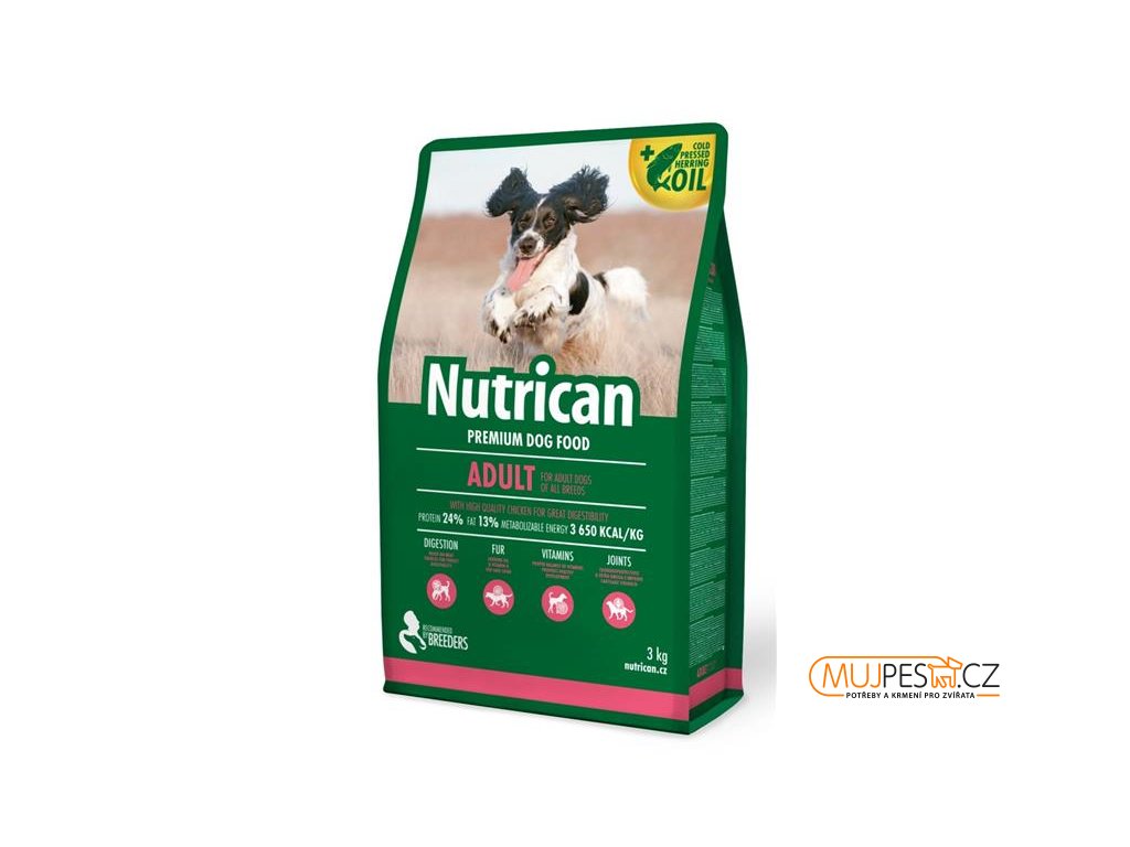 Hrubý protein 24,0 %, obsah tuku 13,0 %, vlhkost 10,0 %, hrubý popel 6,0 %, hrubá vláknina 3,0 %, vápník 1,2 %, fosfor 0,9 %, sodík 0,1 %.