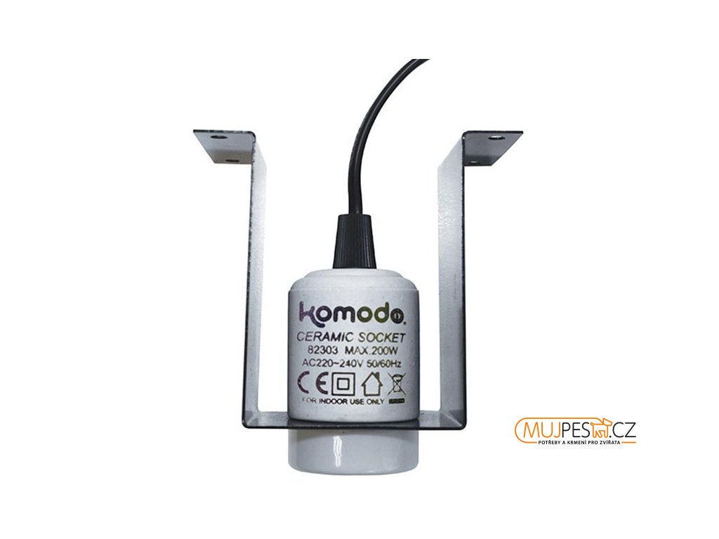 Žáruvzdorná keramická objímka Komodo Ceramic Lamp Fixture and Mounting Bracket s kovovou konzolou umožňuje snadnou a bezpečnou instalaci výhřevného nebo světelného zdroje v teráriu. Objímka má dlouhý napájecí kabel s vypínačem a zástrčkou (vidlice).