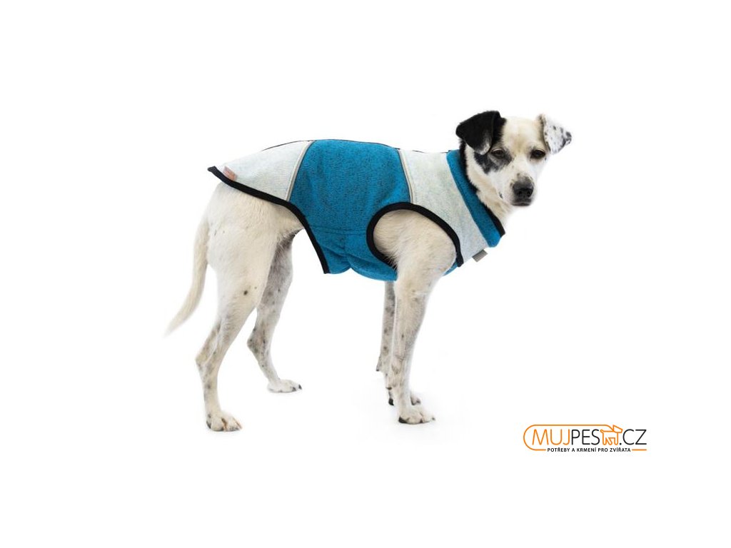 Svetr Frankie z kvalitní úpletoviny je ideální obleček do chladnějšího, ale suchého počasí. Obleček je vhodný i pro starší a nemocné psy nebo psy, kteří se neradi oblékají. Je tvarovaný anatomicky tak, aby psa neomezoval v pohybu, a přitom chránil všechny důležité partie jeho těla. Okraje jsou obšité pružným lemem, takže neodstávají a vesta díky tomu výborně drží na těle psa, nepodfukuje a neuniká zpod ní teplo. Pod krkem je všité poutko pro zavěšení (např. při sušení). Oblékání je velmi snadné a rychlé: přední nohy prostrčíte skrz otvory a obleček zapnete pomocí zipu všitého přes celá záda. Pro bezpečnější venčení za zhoršené viditelnosti je vesta opatřena reflexními prvky.