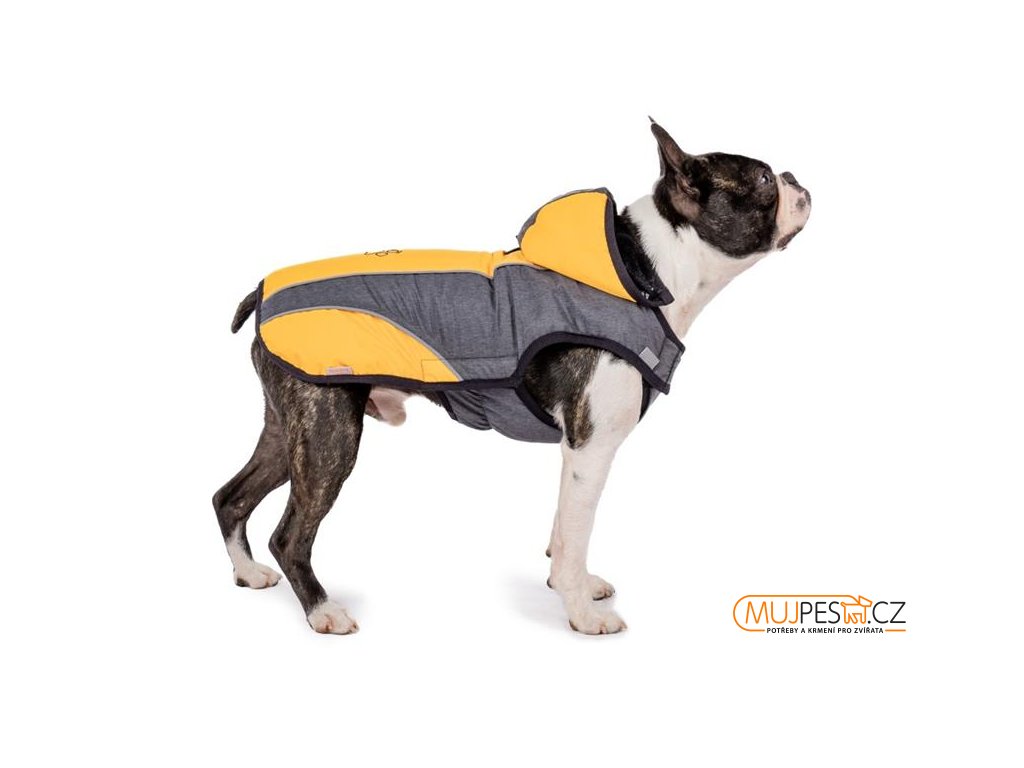 Zateplená vesta Esmé Lux II ochrání vašeho psa před chladem, větrem, deštěm i sněhem. Svrchní vrstva z bundové tkaniny s voděodolným zátěrem je zateplená vafixem a podšitá měkkým flanel fleecem, který nezacuchává srst. Obleček je tvarovaný tak, aby psa neomezoval v pohybu, a přitom chránil všechny důležité partie jeho těla. Gumičky na zadní nohy a ocásek zajišťují, aby vesta neodstávala v zadní části, a elastický lem brání úniku tepla po celém obvodu oblečku. Za krkem je otvor pro připnutí vodítka k obojku a poutko pro zavěšení (při sušení atd.). Oblékání je snadné a rychlé díky systému suchých zipů: oboustranné zapínání pod krkem umožňuje optimální nastavení obvodu krční části a zipy na bocích umožňují zapnutí břišní části zleva i zprava. Pro bezpečnější venčení za zhoršené viditelnosti je vesta opatřena reflexními prvky.