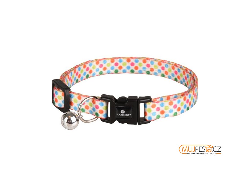 Nylonový obojek Flamingo Arya je určený pro kočky všech plemen. Má nastavitelnou délku a zapíná se na bezpečnostní plastovou karabinu. Obojek je opatřený rolničkou, která upozorní ptáky na přítomnost kočičího predátora.