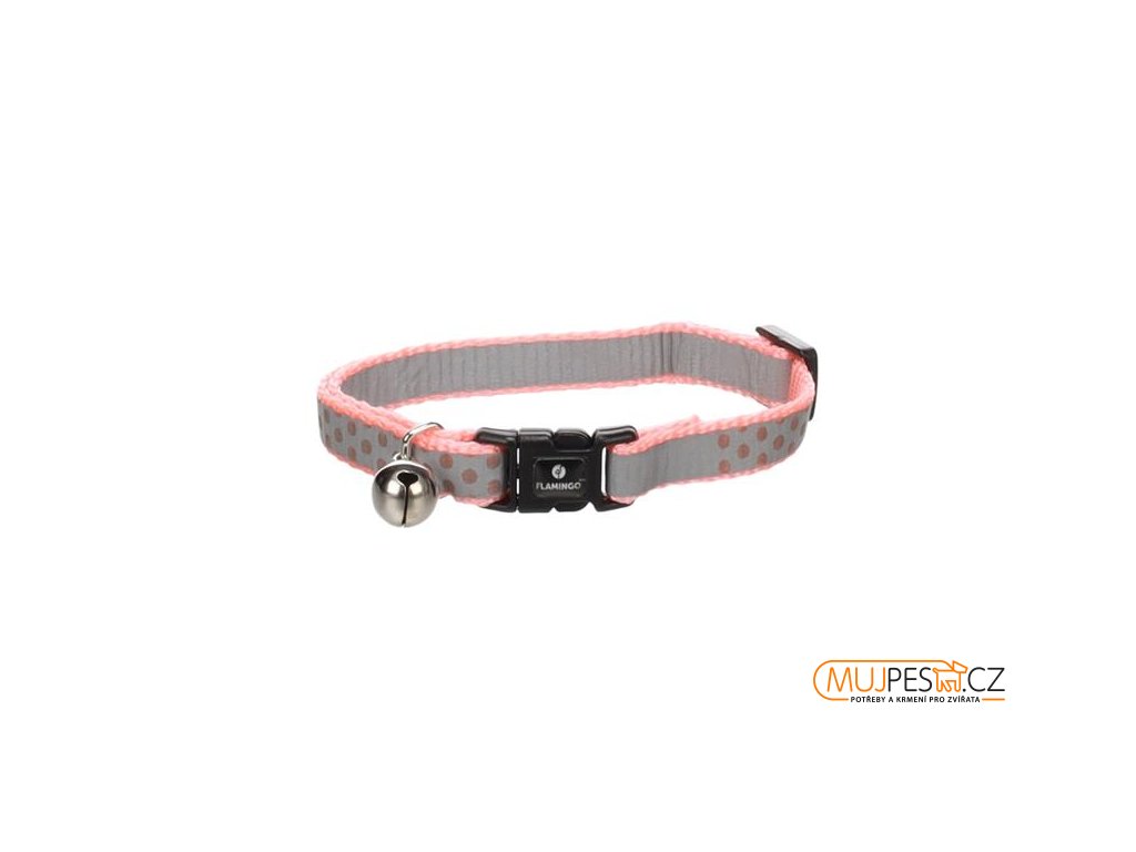 Obojek z odolného nylonu má po celé délce široký reflexní pás, který zvyšuje bezpečí kočky za snížené viditelnosti. Zapíná se na plastovou přezku s bezpečnostním zámkem. Délku lze nastavit v rozsahu 20–34 cm. K obojku je připnutá rolnička, která při pohybu jemně zvoní a varuje tak potenciální kořist.