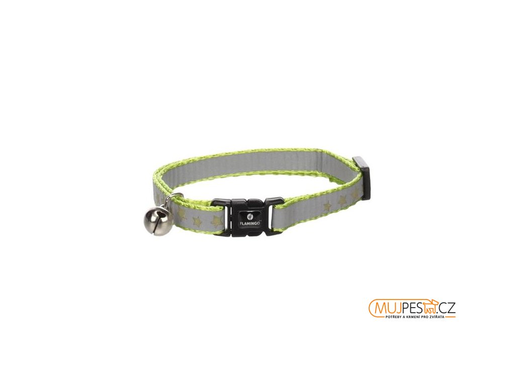 Obojek z odolného nylonu má po celé délce široký reflexní pás, který zvyšuje bezpečí kočky za snížené viditelnosti. Zapíná se na plastovou přezku s bezpečnostním zámkem. Jeho délku lze nastavit v rozsahu 20–34 cm. K obojku je připnutá rolnička, která při pohybu jemně zvoní a varuje tak potenciální kořist.