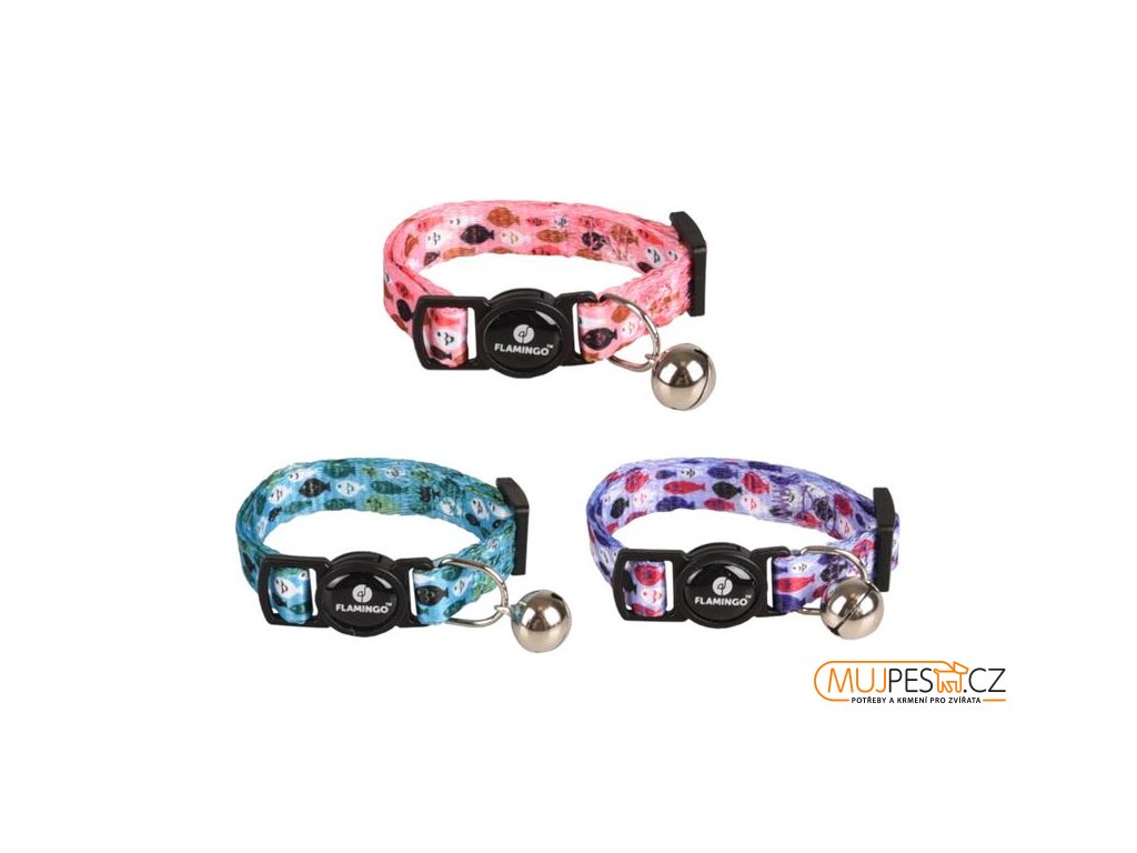 Nylonový obojek Flamingo Minou je určený pro koťata všech plemen. Má nastavitelnou délku a zapíná se na bezpečnostní plastovou karabinu. Obojek je opatřený rolničkou, která upozorní ptáky na přítomnost kočičího predátora.