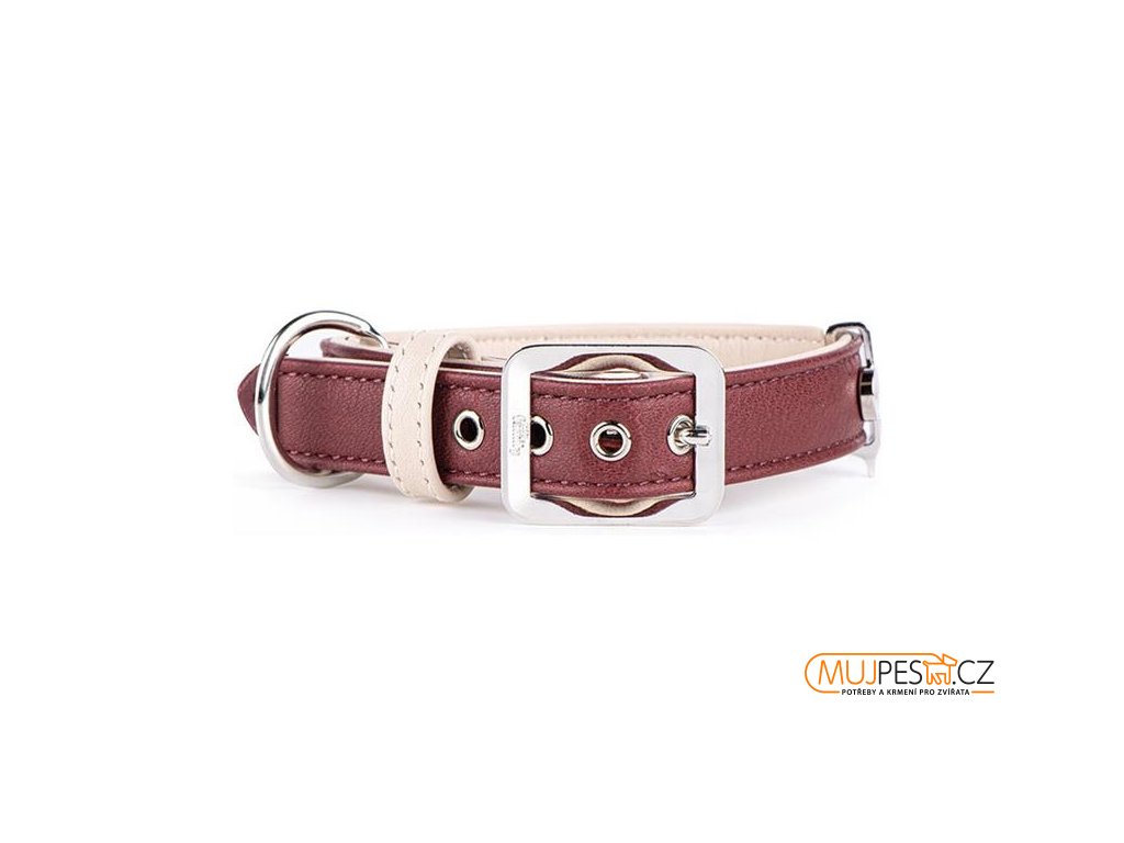 Obojek pro psy z kolekce Hermitage z pravé italské vínové/béžové kůže s bílou bronzovou povrchovou úpravou. Obojek je vyroben z kvalitního materiálu a má očko na známku značky MyFamily.