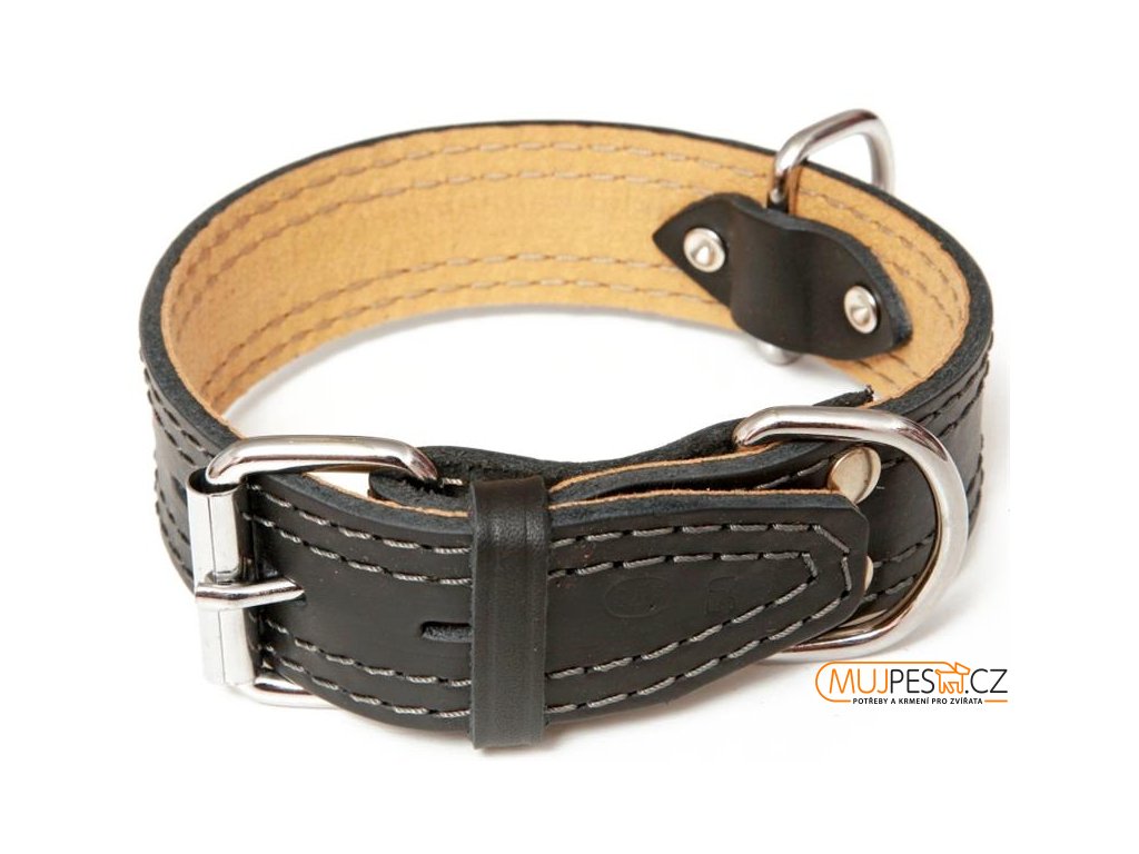 Kožený šitý obojek z vrchové hovězí kůže od společnosti B&F. Obojek je zdobený prošitím. Velice snadné zapínání na velkou kovovou sponu.