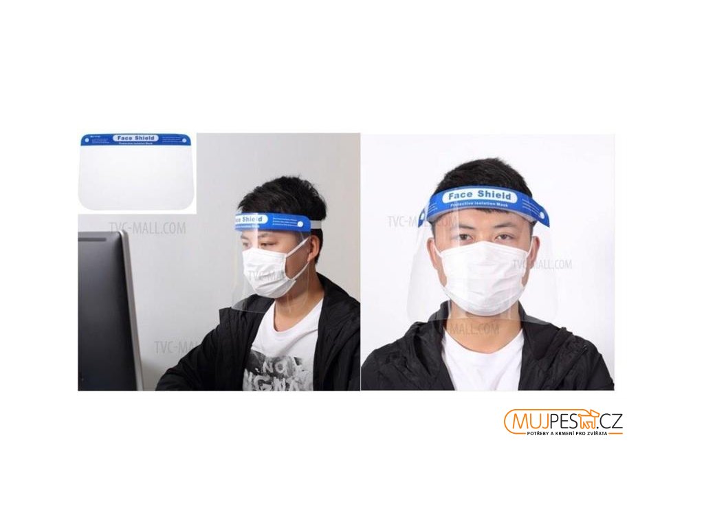 Ochranný štít na obličej umožňuje současné použití dioptrických brýlí i roušky. Je vyroben z plastového materiálu.