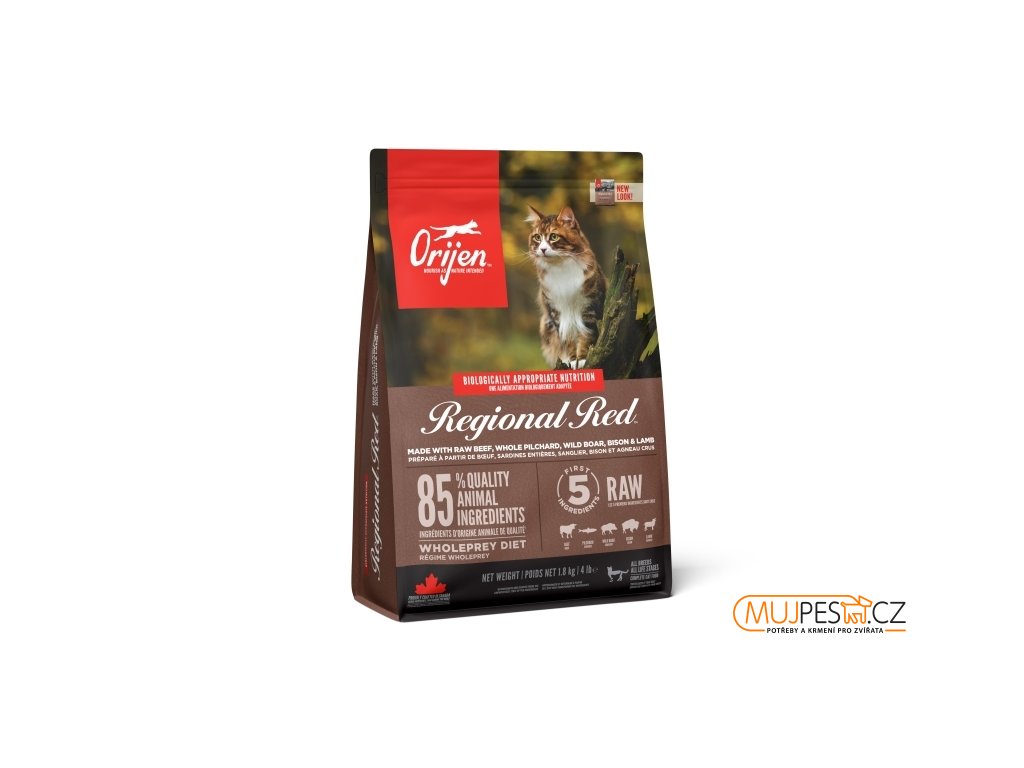ORIJEN REGIONAL RED je plný proteinu pocházejících z hovězího plemene Angus, divokého kance, bizona, jehněte plemene Romney a tradičního kanadského vepřového. Všechny suroviny jsou nám dodávány místními dodavateli vždy čerstvé v bohatě výživném podílu Celé kořisti. S hrdostí připravujeme ORIJEN v našich vítězně oceňovaných kuchyních NorthStar®. Krmiva ORIJEN zaručí, že vaše milovaná kočka nebo kotě budou zdravé, spokojené a silné.