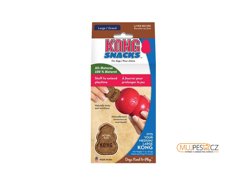 Lahodné, křupavé pamlsky KONG Snacks™ Liver z kuřecích jater jsou díky svým rozměrům vhodné jako náplň do větších hraček KONG.