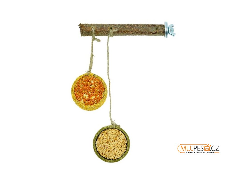 Na bidýlku z lískové větvičky opatřeném kovovým šroubením pro snadné uchycení na klec jsou zavěšená dvě kolečka z kartonu obaleného bylinkami, plněná lahodnými semínky, ovocem a zeleninou. Na bidýlko s vyvrtanými dírkami lze případně navěsit další dobroty. Proměňte klec v papouščí ráj!