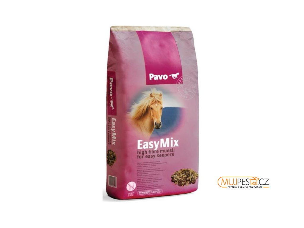 Koně a poníci, kteří nepracují nebo jezdí pouze rekreačně, často nepotřebují mnoho energie navíc. Pavo EasyMix je müsli s vysokým obsahem vlákniny, bez obilovin a melasy, které obsahuje jen velmi malé množství cukru, škrobu a energie. Je bez obilovin a melasy, ale obsahuje všechny vitamíny a minerály, které váš kůň potřebuje.