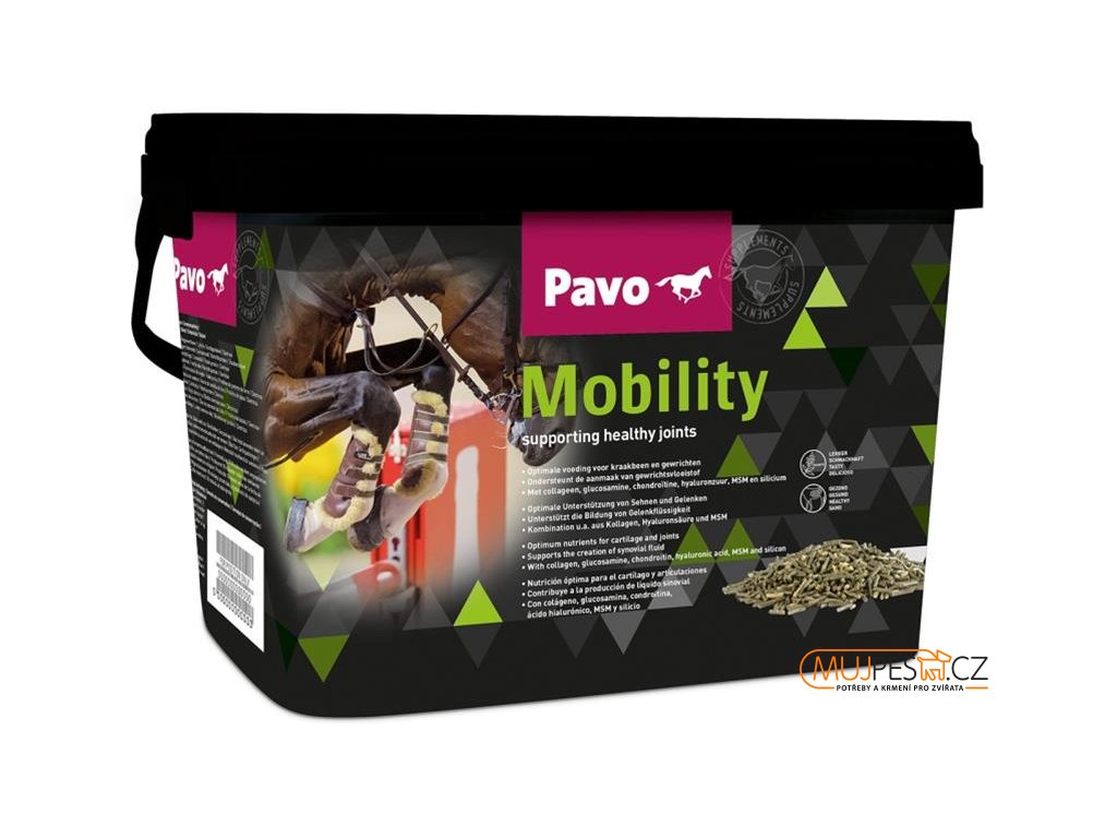 Pavo Mobility obsahuje glukosamin a kyselinu hyaluronovou, které jsou součástmi zdravé synoviální tekutiny. Chondroitin a MSM (síra) mají na chrupavku pozitivní vliv. Samotné tyto látky však k podpoře zdravých kloubů koní nepostačují. Nejdůležitější součástí v Pavo Mobility je speciální kolagen, podporující kosti a chrupavku. Pavo Mobility obsahuje také vitamín C a mikrominerál křemíku, který sehrává roli při vývoji kostní tkáně, chrupavky, kolagenu a kyseliny hyaluronové. Pavo Mobility neobsahuje pšenici a je tak bezlepkový.