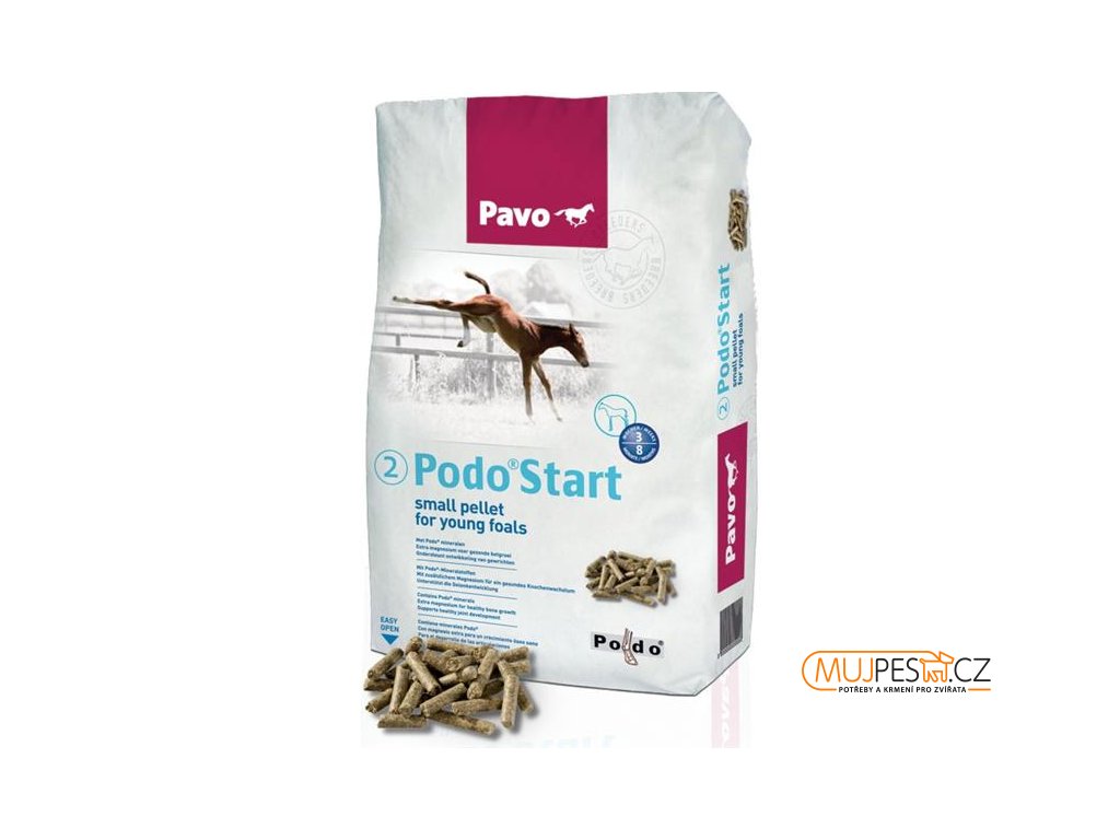 Chutné Pavo Podo® Start (5 mm granule) je bohaté na vysoce kvalitní bílkoviny (aminokyseliny) a kromě toho poskytuje všechny nezbytné vitaminy a minerální látky vašemu hříběti. To zajistí hladký přechod z kobylího mléka na tuhé krmivo. Extra přidaný hořčík povzbuzuje kosti k rychlému růstu, zinek a mangan v lehce stravitelných formách zajišťují nepřerušený růst kostí, který je důležitým krokem k prevenci OC a OCD během prvních 8 měsíců.