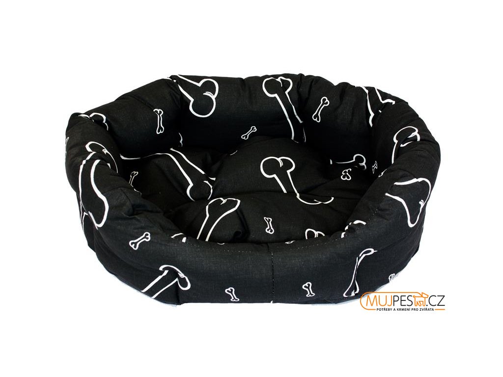 Pohodlný, kvalitní pelech vyrobený z bavlněné látky potištěné kostmi a kostičkami, vyplněný dutým vláknem. Pelíšek je v několika bodech prošitý, aby nedošlo k nerovnoměrnému rozmístění výplně. Polštářek je vyjímatelný. Boky pelíšku jsou kvůli dobré opoře bohatě vyplněny. Pelech se lehce udržuje.
