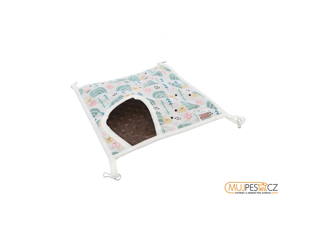 Pohodlný závěsný pelíšek střední velikosti pro chvíle bezpečného odpočinku a zábavy drobných savců. Hamaka je ušitá ze dvou vrstev látky: na vnitřní stranu byla použita měkká a hřejivá minky hnědé barvy, vnější strana je bavlněná s motivem ježků. V rozích jsou všitá poutka opatřená karabinkami pro snadné zavěšení v kleci.
