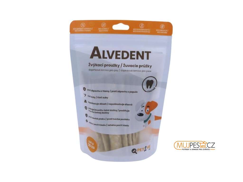 Pravidelné užívání žvýkacích proužků Alvedent pomáhá odstraňovat zápach z tlamy psa a bránit tvorbě plaku (z vrstev plaku se vytváří zubní kámen). Obsažená laktoperoxidáza zvyšuje přirozenou imunitu a obranyschopnost ústní dutiny. Žvýkáním chutných proužků si psi mechanicky čistí zuby a odstraňují zbytky krmiva. Současně se tak uvolňují enzymy, které zabraňují tvorbě plaku.