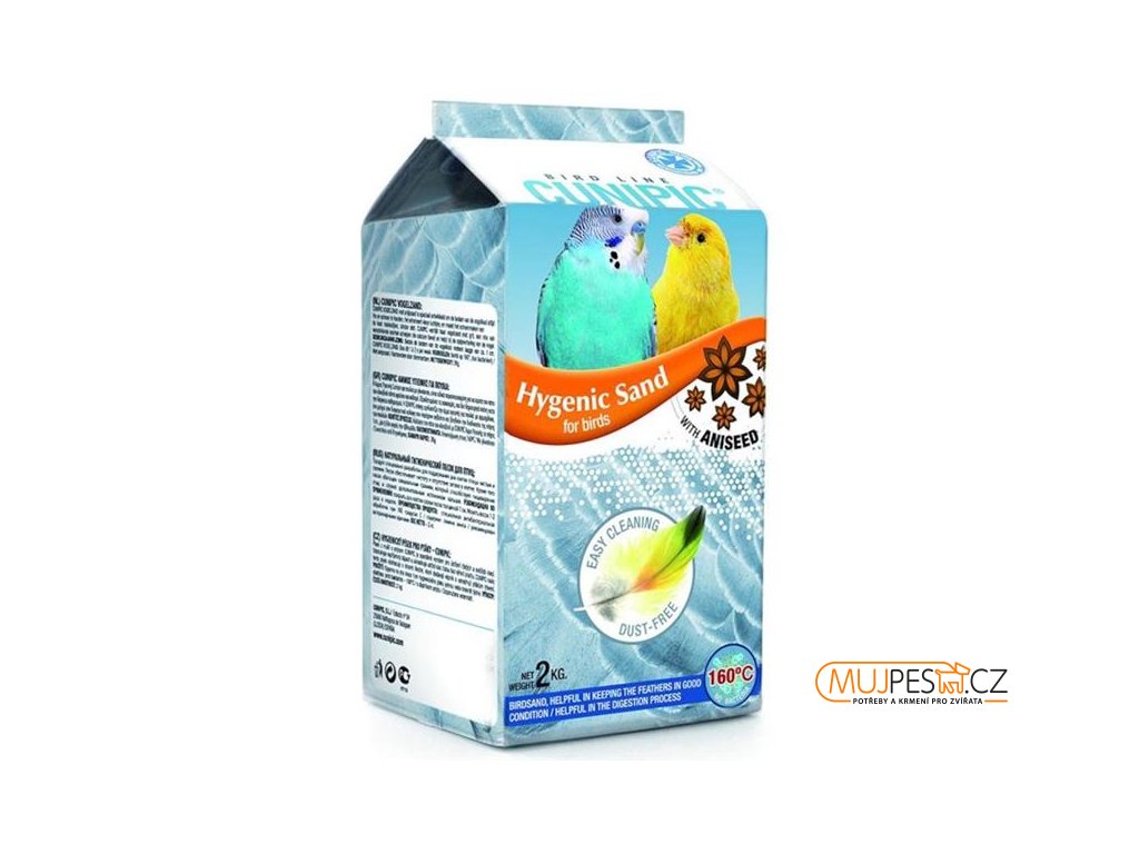 Hygienický písek pro ptáky s anýzem je speciálně vyvinutý písek pro čistotu, svěžest a vysokou hygienu na dně klece. Eliminuje nepříjemné pachy, je bezprašný a usnadňuje údržbu klece. Písek obsahuje části mušlí s kamínky, které ptáci potřebují pro snadnější trávení. Před balením je dezinfikován teplotou 160°C. Písek se rozprostírá na dno klece do výšky cca 1cm, mění se 1 - 2x týdně.