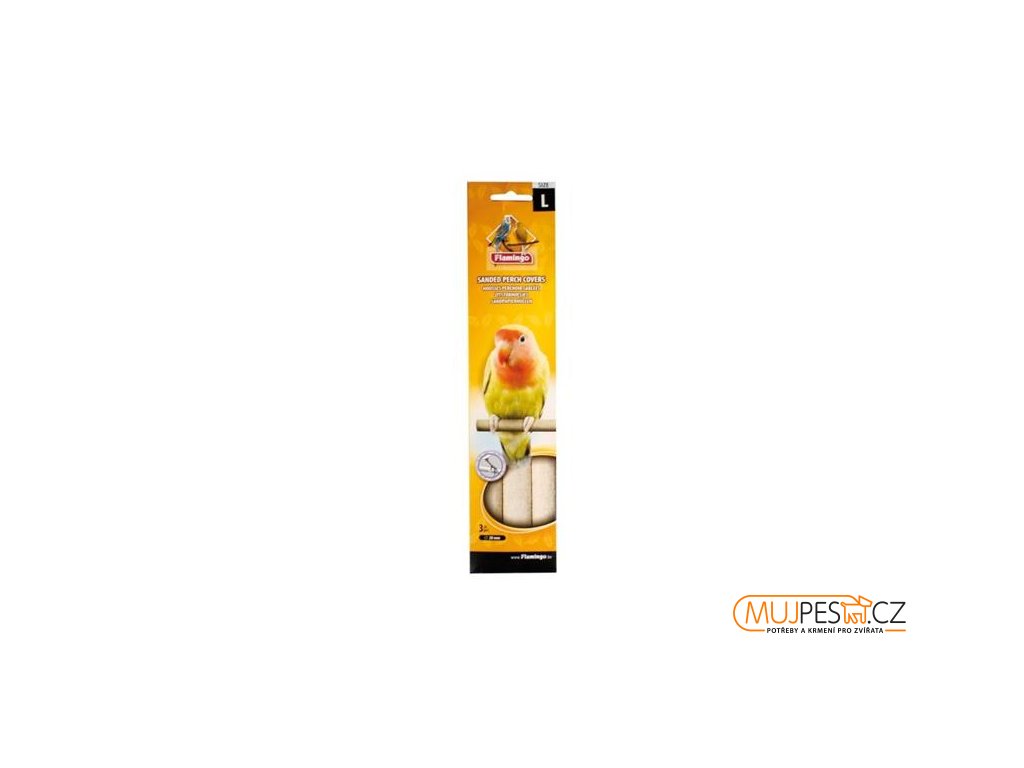 Papírové návleky pokryté pískem na bidýlka do klecí. Pomůcka pro broušení zobáků a drápků u exotického ptactva.